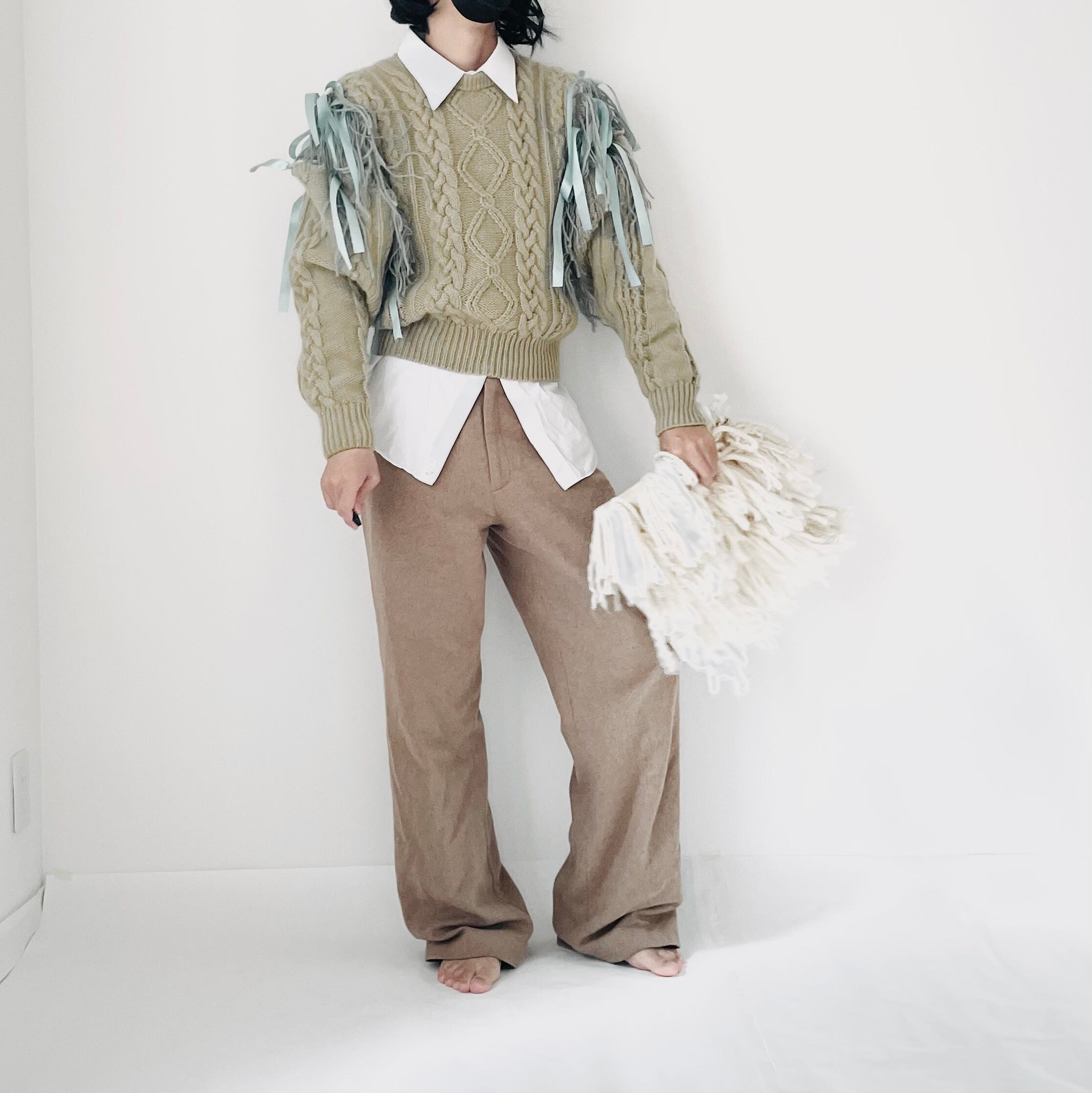 ドロップショルダーとワイドシルエットがラフな雰囲気のニットプルオーバー。肩のフリンジが個性的で、ゆったりとしたラインでパンツとの相性は抜群。お家時間やデイリーな着こなしをお楽しみいただけます。