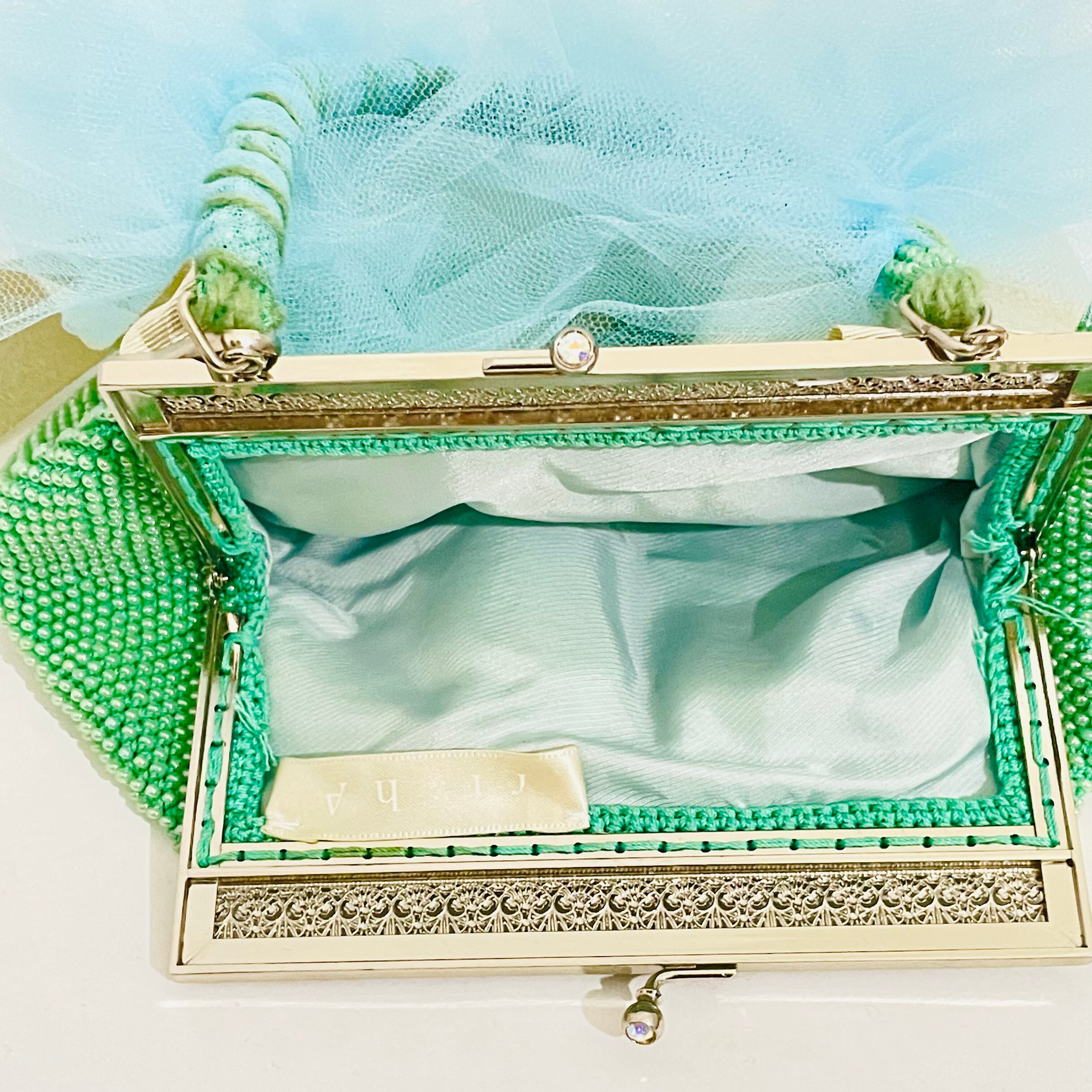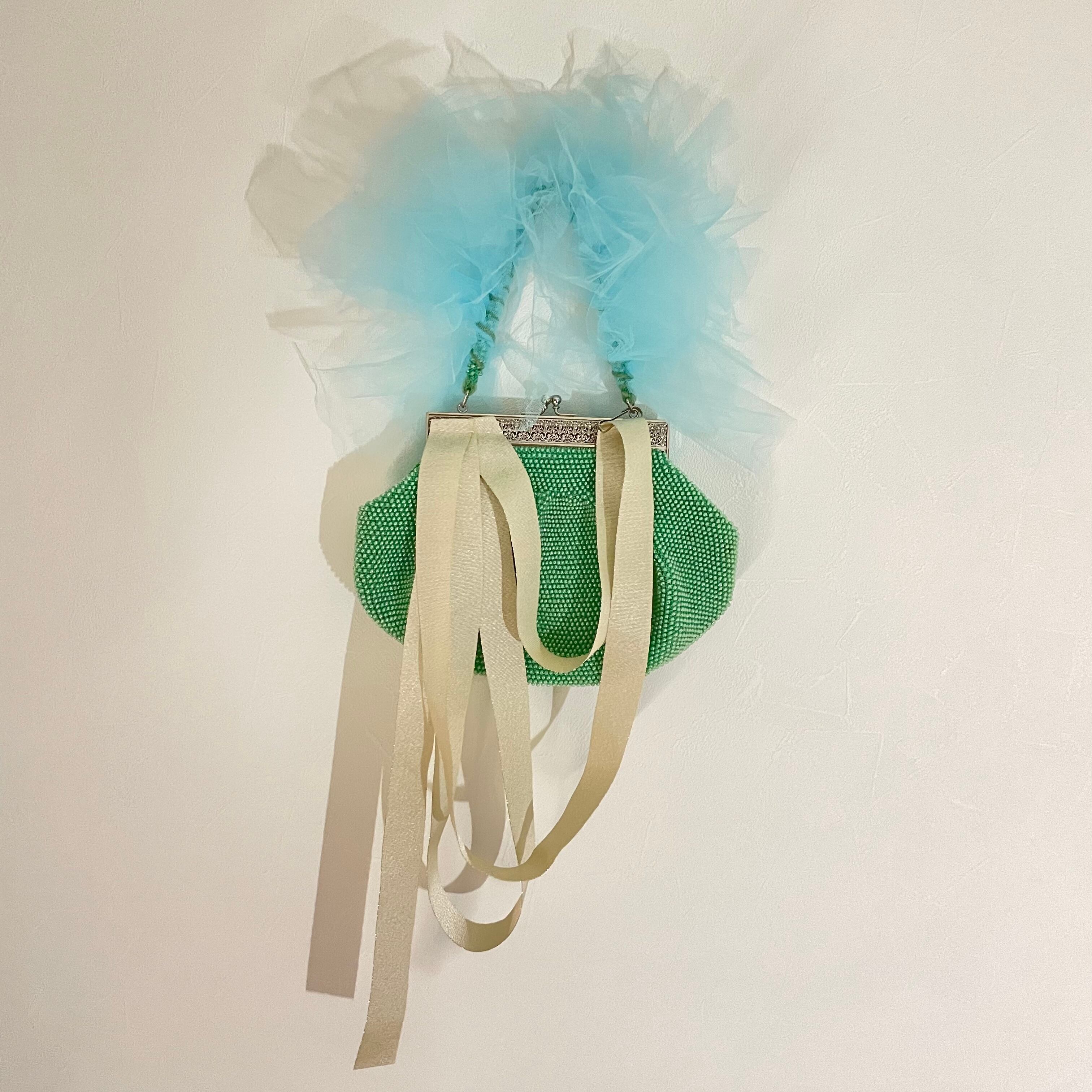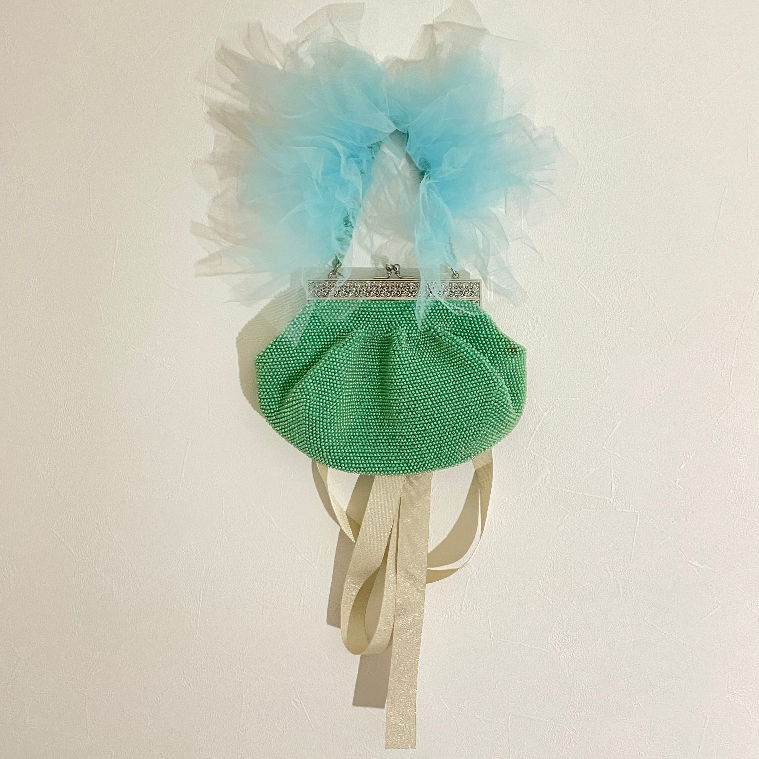 ハンドルにチュールをあしらったビジューバック。がまぐちタイプの蓋が大きく開き中身が見やすく取り出しやすいです。無造作なリボンが風に揺れて優雅さを演出。